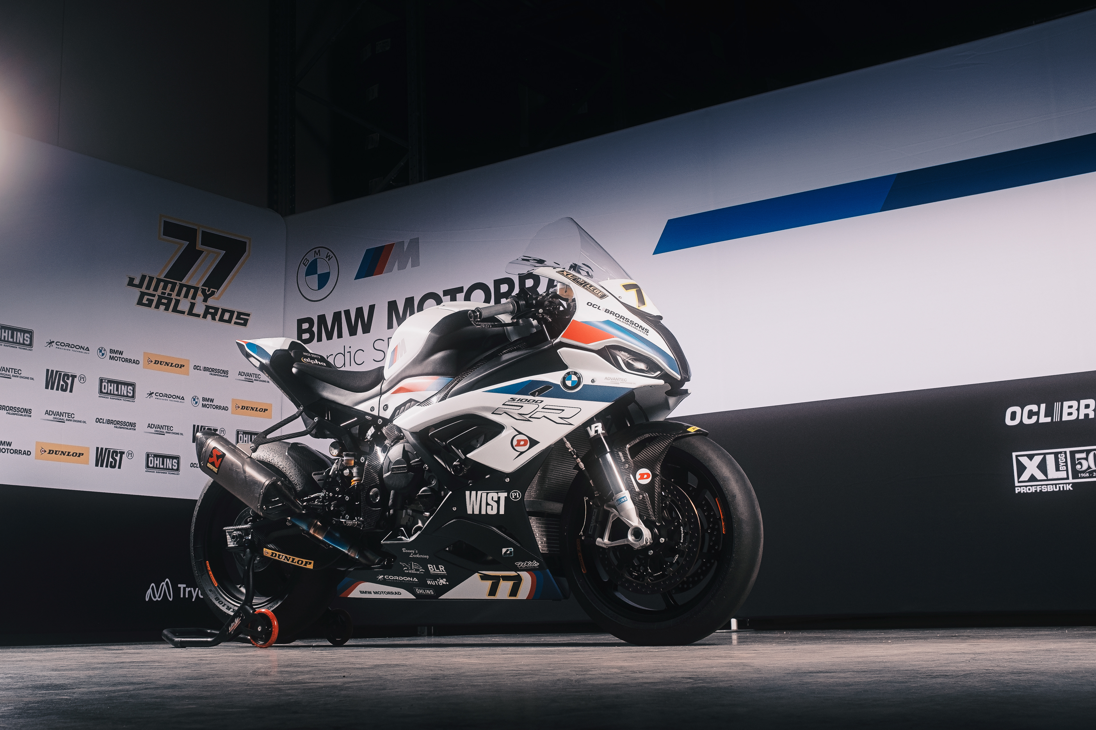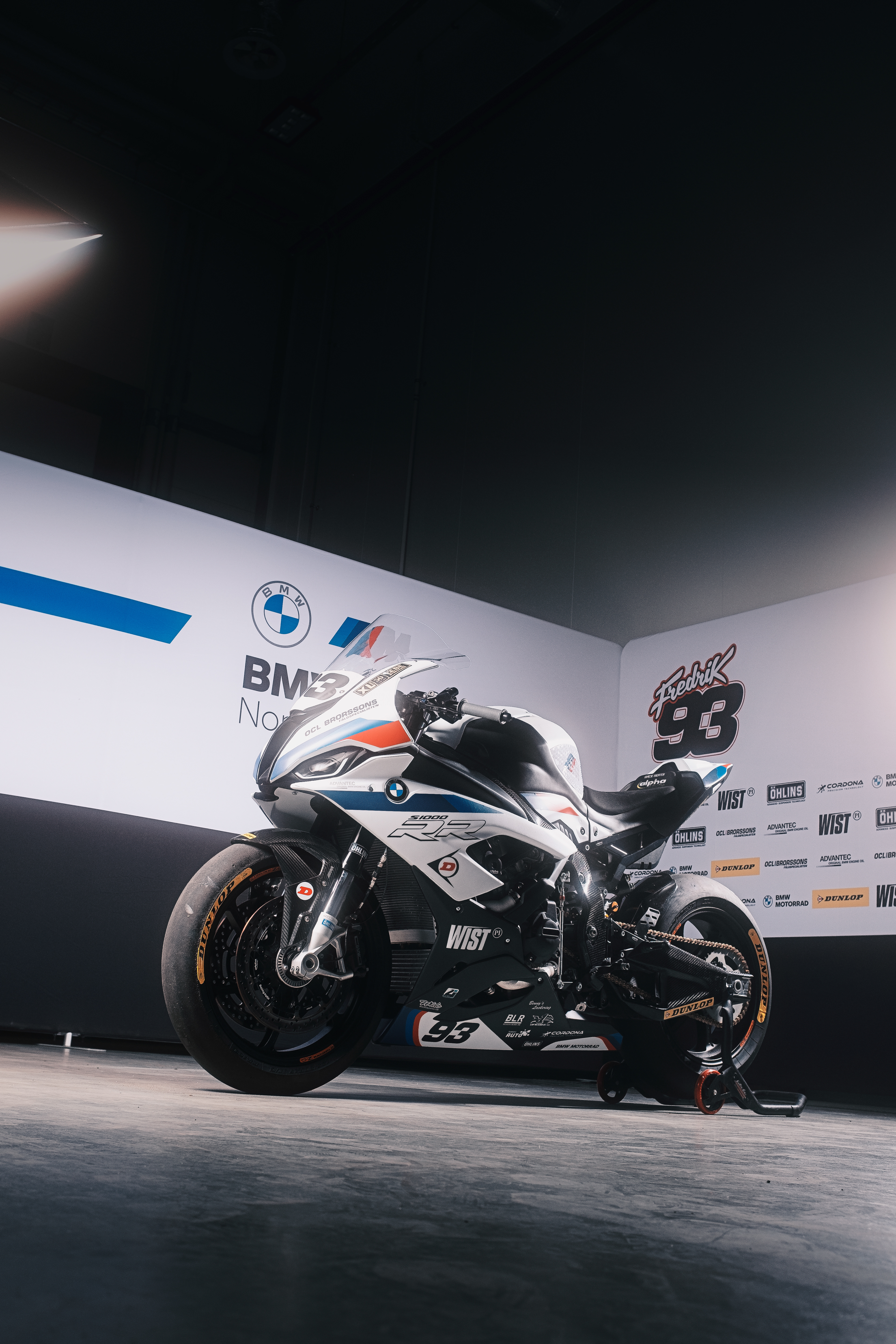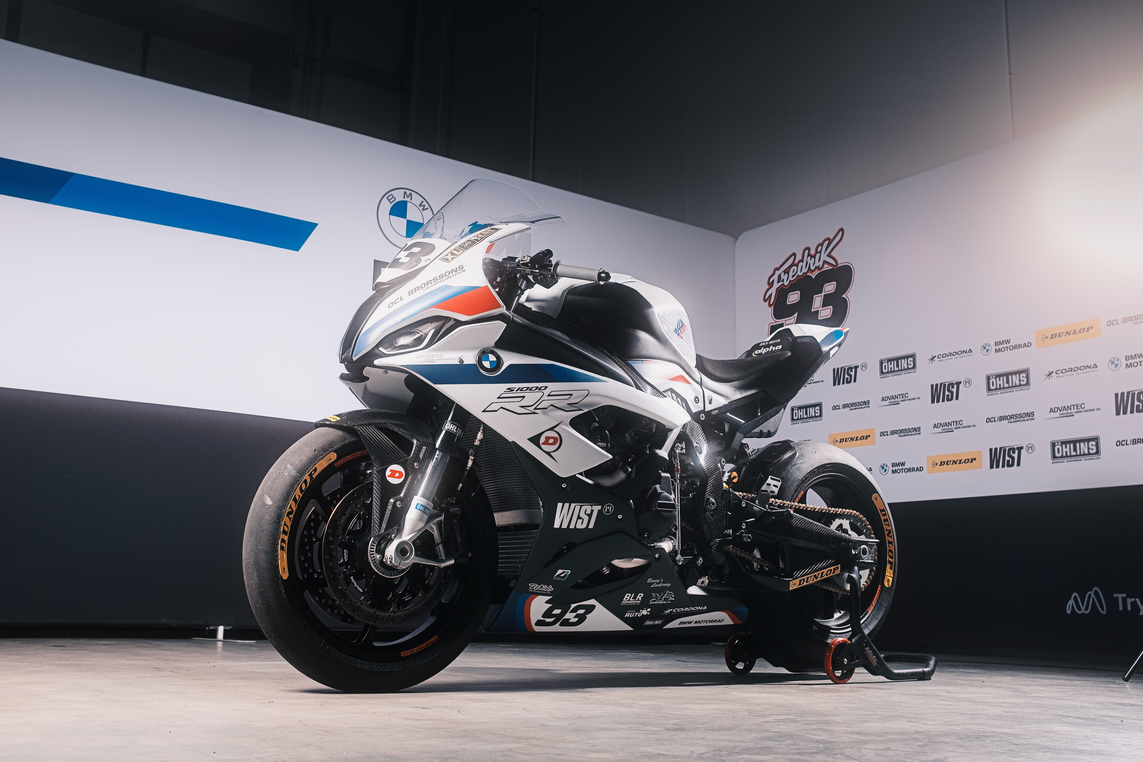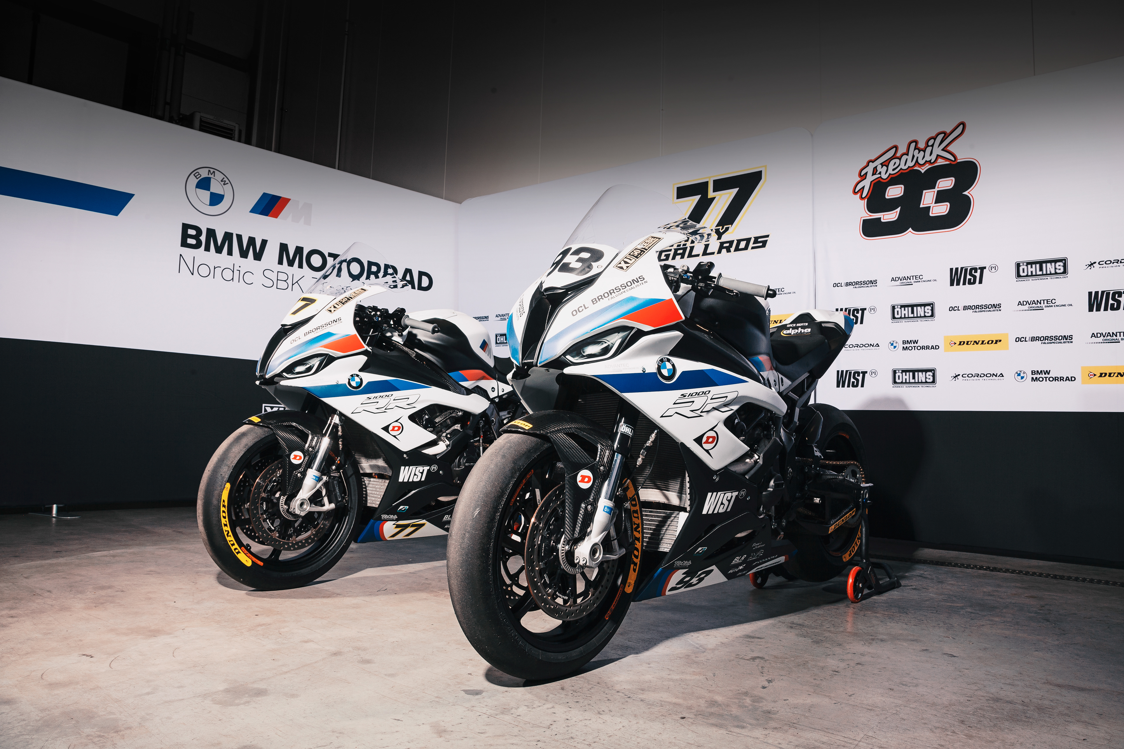 A photoshoot for the BMW Motorrad Nordic Super Bike team to launch their 2021 season livery design. On the pictures the teams two bikes belonging to the riders Fredrik Eriksson 93 and Jimmy Gällros 77.